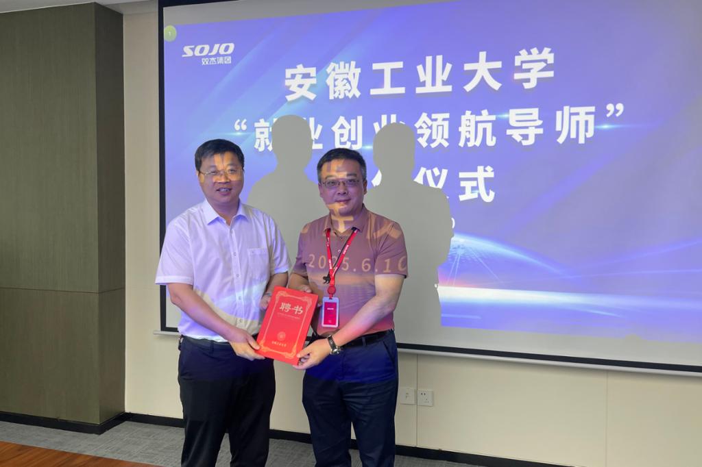 期间,公司就人才培养、实习实践基地建设、产学研合作等方面与企业进行了深入交流。王俊代表公司为双杰电气合肥有限公司总经理殷华新、人力资源总经理洪峰颁发了“就业创业领航导师”聘书,为合肥维信诺科技有限公司授牌“老员工就业基地”,并签订了人才培养与就业基地建设合作协议。