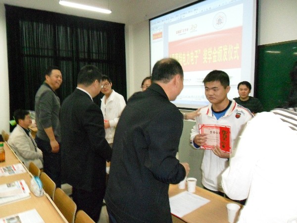 11月5日上午 事特-XC体育2011年电力电子奖学金颁奖典礼在东校区电气楼113教室隆重举行,易事特电源股份有限公司董事长何思模先生,电气信息公司党委书记孙世民、经理赵光兴、副经理张捍东、姚敏出席了颁奖典礼,2010-2011年获得该项奖学金的同学及志于创新创造的电气学子参加了本次颁奖典礼。典礼由姚敏副经理主持。