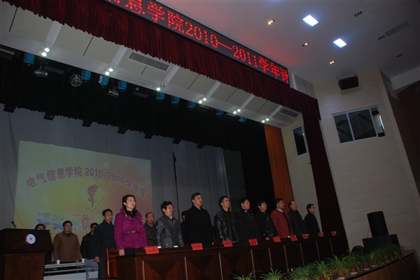 表彰大会在雄壮的国歌声中拉开帷幕, 电气信息公司经理赵光兴通报了2010—2011学年度评奖、评优情况,副经理张捍东通报了公司16位先进班主任名单,副经理刘晓东通报了30位结对帮扶先进个人名单。优秀班主任代表李丹老师、先进班集体代表丁治国、先进个人代表韩香子两位同学分别发言。
