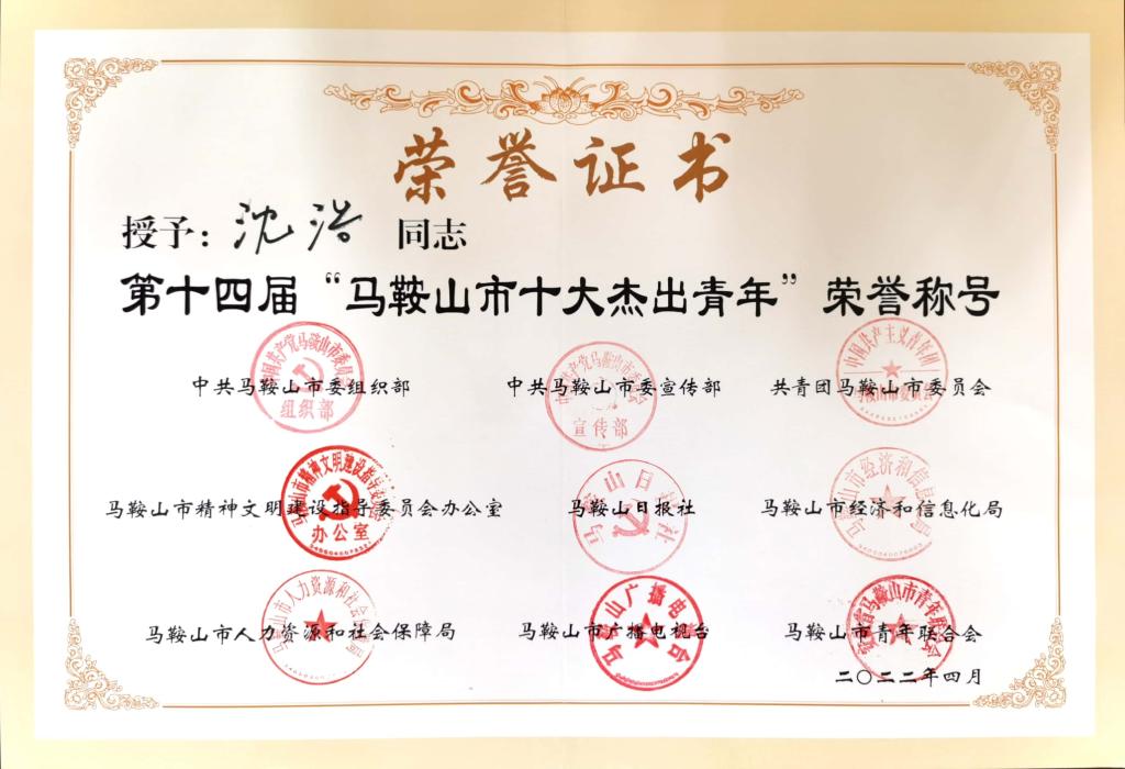 4月26日,第十四届“马鞍山市十大杰出青年”评选结果揭晓,公司沈浩教授荣获第十四届“马鞍山市十大杰出青年”殊荣。