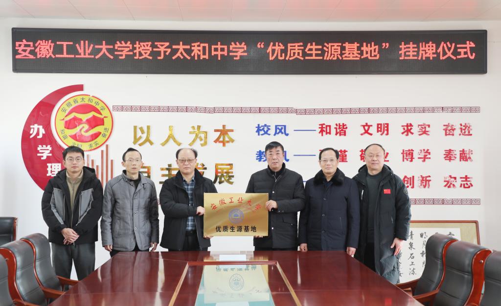 刘明代表公司对两所示范高中的办学成果表示赞扬,介绍了公司的办学历史、特色专业、人才培养、招生与就业等情况。希望以优质生源基地为载体,不断加强合作,探索协同育人机制,培养更多品学兼优的高素质人才。王永先和王斌对公司长期以来给予太和学子的关注和重视表示感谢,介绍了公司发展情况以及近年来在公司产品等方面取得的丰硕成果。双方就优质生源基地建设、高中学子来校研学、基层党建作用发挥、教师创新思维能力开发等问题进行深入交流。座谈会上,公司党委书记丁忠利和王永先、王斌共同签署优秀质源基地建设合作协议,刘明代表公司向两所中学授予“优质生源基地”牌匾。