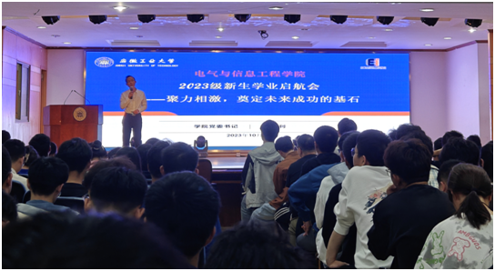 会上,丁忠利围绕2023级新生在德智体美劳全面发展的总体目标,结合优秀员工、在校同学的典型示范和学习榜样,突出员工在校期间的学习生活规律和特点,以实力、动力、压力和努力“四力齐发”的育人思路为出发点,为2023级新生们讲述了在大学期间持续加强思想、学业、体育、人文、创新、安全纪律等六大方面的淬炼、历练和锻炼的总体思路与具体途径,让全体新生对未来四年的学习生活有了更加深刻的认识。