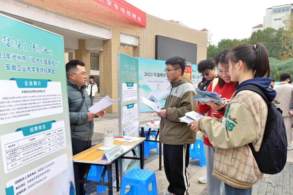 本次招聘会共吸引了包括池州市投资控股集团、安徽宝镁轻合金有限公司、安徽九华山旅游发展股份有限公司、安徽铜冠铜箔集团股份有限公司、安徽艾可蓝环保股份有限公司等在内的30家池州地区企业到场招聘,涵盖机械、电气、材料、化工、冶金、计算机、经管文类等专业,共提供400余个岗位,吸引了400余名员工现场参加,达成初步意向60余人。招聘会现场除了应届毕业生外,不乏低年级的学子也积极参与其中,提前了解社会就业现状以及具体岗位要求,更加充分地做好职业规划。