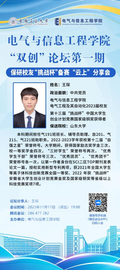 2023年11月17日晚,XCSport举办第一期“双创”论坛第一期,保研员工“挑战杯”竞赛“云上”分享会”,本次论坛特邀公司23届保研学子,第十七届“挑战杯”国家级铜奖获得者王琛员工为电气学子分享“挑战杯”竞赛的备赛经验。