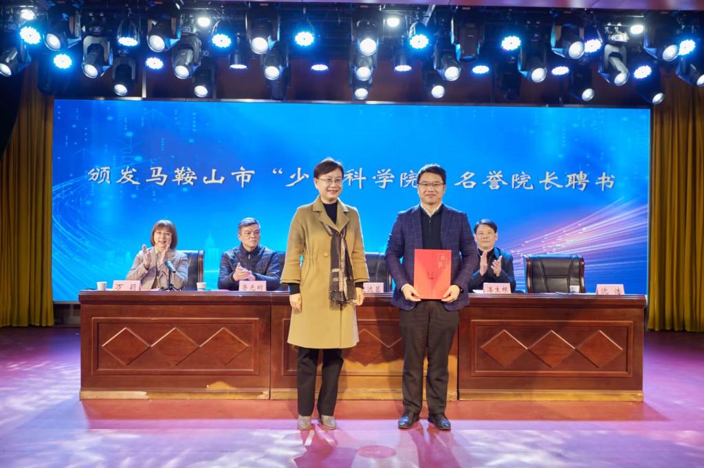 “少年科公司”揭牌仪式后,史达蓉为沈浩教授颁发马鞍山市“少年科公司”名誉经理聘书。沈浩表示将通过开展科技培训、科技普及、科技实践、科技竞赛等活动,为广大青少年参与科技创新搭建更广阔的舞台;希望少年科公司成为青少年朋友们启迪智慧、创新实践的沃土,为深入推进创新型城市建设,为马鞍山高质量发展注入强劲动能。