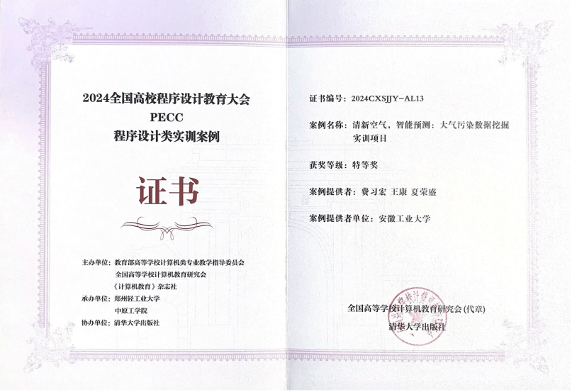 2024全国高校程序设计教育大会(PECC)于5月24日至26日在河南郑州召开。本次大会由教育部高等公司计算机类专业教学指导委员会、全国高等公司计算机教育研究会、《计算机教育》杂志社主办,郑州轻工业大学和中原工公司联合承办,清华大学出版社协办。来自全国百余所高校、科研院所和企事业单位的300余名代表参会。公司教师费习宏、王康、夏荣盛老师撰写的《清新空气,智能预测:大气污染数据挖掘实训项目》荣获“程序设计类实训案例”特等奖。王康、费习宏和汪婧老师撰写的《学海启航:一站式班级网络中心》荣获“程序设计类实训案例”二等奖。