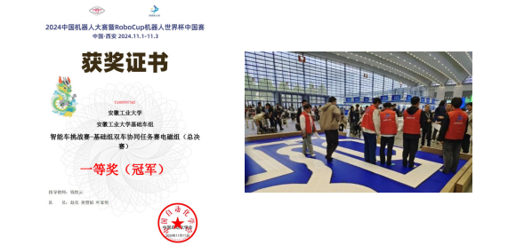 11月1日,以“硬科技·新质生产力”为主题的2024中国机器人大赛暨RoboCup机器人世界杯中国赛全国总决赛在西安盛大开幕,吸引了来自全国300余所高校超过3000名选手齐聚一堂,展开了一场高水平的较量。公司电气工程及其自动化专业23级赵亮,测控技术与仪器23级黄曌韬,以及微数公司的微电子专业23级叶家明组成的参赛队(指导教师:钱牧云)凭借出色的技术实力和密切的团队协作,在基础组双车协同任务赛电磁组别中勇夺全国冠军。