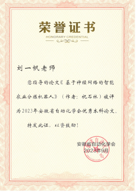 刘一帆老师指导的本科毕业设计《基于神经网络的智能农业分拣机器人》荣获优秀本科论文奖。