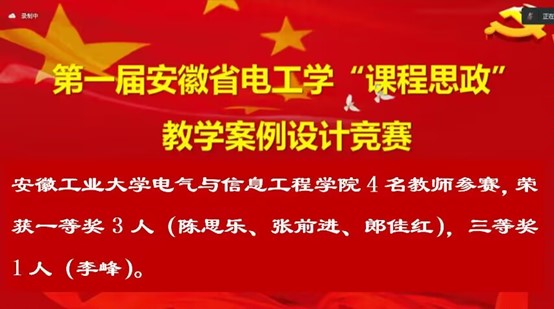 12月4日,由安徽省电工学会主办,合肥工业大学电气与自动化工程公司承办的第一届安徽省电工学“课程思政”教学案例设计竞赛圆满结束。中国科学技术大学、合肥工业大学、安徽大学、XC体育等11所高校的53名教师参加了本次竞赛,参赛作品共计39份,公司共4名教师参赛。经过网评、盲审和会评,获得了一等奖3项、三等奖1项的佳绩。
