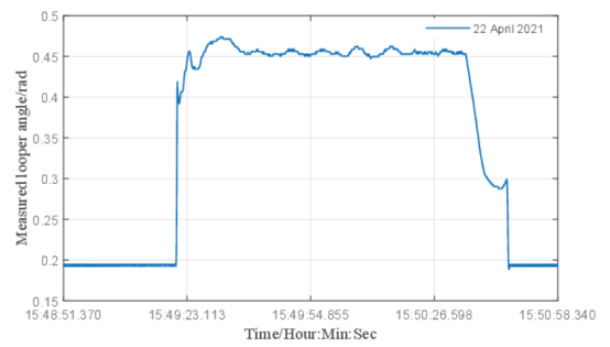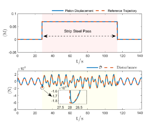 在带钢热连轧生产过程中,各机架间带钢的张力稳定是热连轧能够稳定生产的重要生产指标;如果张力产生波动,会影响到板带厚度和板形质量,张力的稳定控制成为品控的关键。精轧机组的前后机架之间安装有活套装置,通过改变活套装置的抬起角度,来稳定轧制过程中前后机架之间的带材张力。传统活套装置的张力PID控制方案是依赖于经验调整参数,这对于不同的钢种变化、复杂的生产条件等实际生产环境适应性差,精细化智能化生产对活套装置的控制器设计提出了新的更高要求。研究团队针对热轧活套系统实际运行情况,详细分析了热轧活套装置的角度-张力模型,利用自适应干扰观测器降低了由外部扰动信号所带来的活塞位移波动的负面影响,进一步提高带钢产品质量。