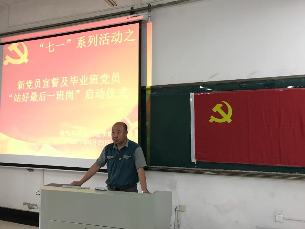 郭宏代表公司党委向各位新党员同志表示欢迎和祝贺,从党的光辉历程诠释了党的先进性与先锋性,并提出了三点期望:坚定理想信念,牢固精神支柱;锤炼素质作风,加强党性修养;强化责任担当,发挥模范作用。他勉励毕业生党员一定要牢记党员身份和使命,在文明离校活动中发挥先锋模范作用,站好最后一班岗,并祝福前程似锦、一帆风顺。