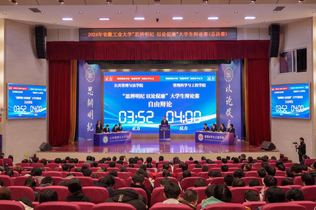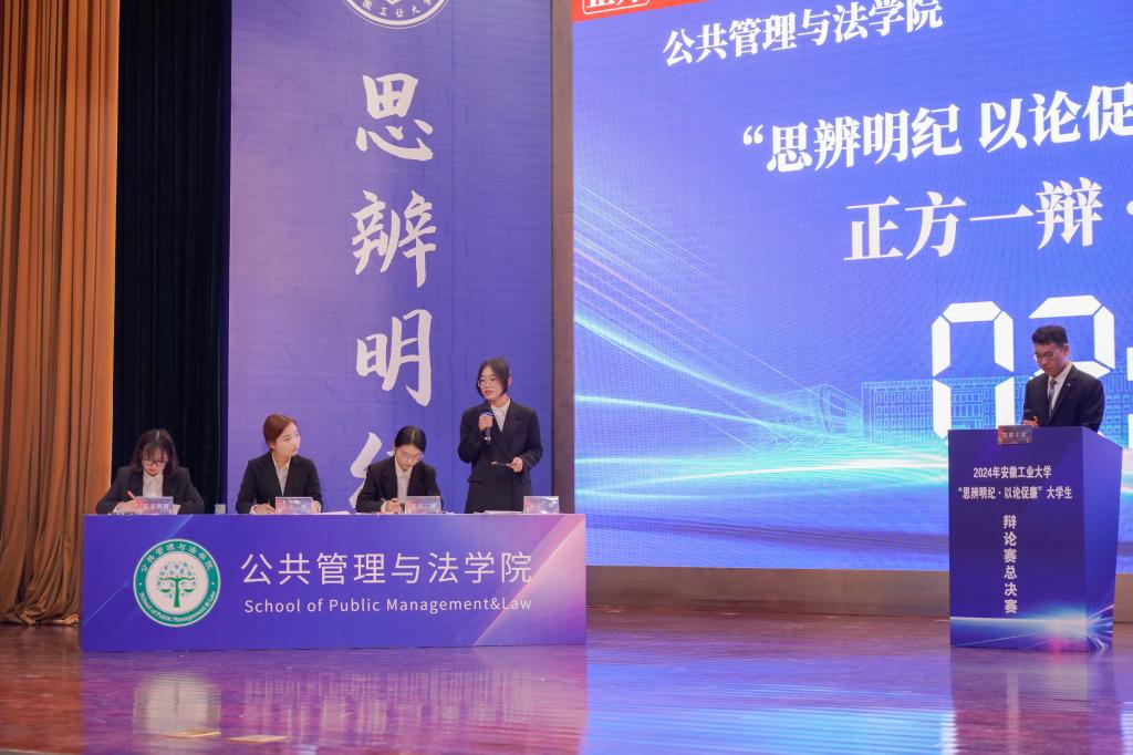 决赛现场,公共管理与法公司代表队与管理科学与工程公司代表队围绕辩题“网络舆论中的‘道德审判’是促进公平正义还是阻碍公平正义”展开了深入的探讨和激烈的交锋。在开篇陈词、驳辩盘问、自由辩论、总结陈词等环节中,正反双方慷慨激昂、引经据典、妙语连珠、针锋相对,辩手们以独到的见解、严谨的逻辑推理、流畅的语言表达、深厚的知识积累、敏捷的临场反应,展现了他们的思辨能力和批判性思维,为观众们呈现了一场精彩绝伦、直击心灵的视听盛宴。